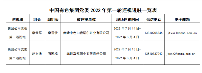 7月14日至15日,中國有色集團黨委兩個巡視組分別進駐赤峰中色白音諾爾礦業有限公司、赤峰富邦銅業有限責任公司開展提級巡視。被巡視企業黨委分別召開巡視工作動員會,各巡視組組長作動員講話,被巡視企業黨委主要負責同志作表態發言。動員會前,集團公司黨委巡視辦有關負責同志參加巡視組與被巡視企業黨政主要負責同志見面溝通會,傳達集團公司黨委、巡視工作領導小組對本輪巡視工作的要求。