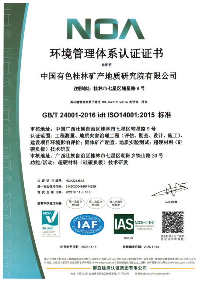 為順利通過(guò)認(rèn)可獲得專業(yè)證書(shū),中色桂林院高度重視,自2022年全面啟動(dòng)認(rèn)證工作以來(lái),主要領(lǐng)導(dǎo)的高位推動(dòng),相關(guān)部門密切協(xié)作,陸續(xù)順利完成了管理手冊(cè)、程序文件的編制,內(nèi)部審核、管理評(píng)審制度匯編,環(huán)境因素、危險(xiǎn)源及法律法規(guī)識(shí)別,文件制度、記錄梳理評(píng)審,安全、環(huán)境合規(guī)性評(píng)價(jià)以及三大規(guī)程完善等工作。11月15日,上海挪亞檢測(cè)認(rèn)證集團(tuán)有限公司為中色桂林院簽發(fā)了ISO14001及ISO45001體系認(rèn)證證書(shū),正式通過(guò)環(huán)境管理、管理體系認(rèn)證。
