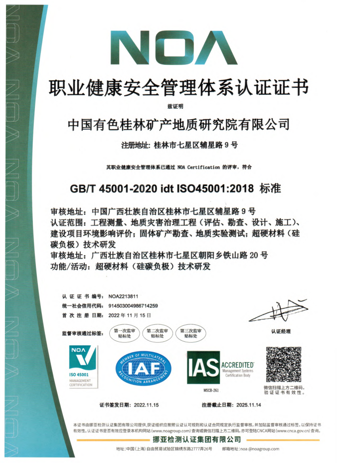 近日,中國(guó)有色桂林礦產(chǎn)地質(zhì)研究院有限公司(簡(jiǎn)稱:中色桂林院)順利通過(guò)ISO14001環(huán)境管理體系及ISO45001職業(yè)健康安全管理體系認(rèn)證審核,并取得體系認(rèn)證證書(shū),標(biāo)志著中色桂林院在環(huán)境保護(hù)、員工職業(yè)健康安全、低碳經(jīng)濟(jì)等方面邁上新的臺(tái)階,企業(yè)全面規(guī)范化管理得到進(jìn)一步強(qiáng)化與提升。