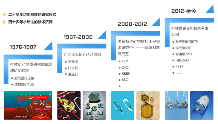 桂林百銳光電技術有限公司,成立于2012年,是一家專業從事水熱法功能晶體生長、晶體器件生產、銷售為一體的國家級高新技術企業、廣西“瞪羚企業”,前身為桂林礦產地質研究院成巖成礦實驗室,曾通過水熱法生長獲得我國第一顆寶石級祖母綠和紅寶石。